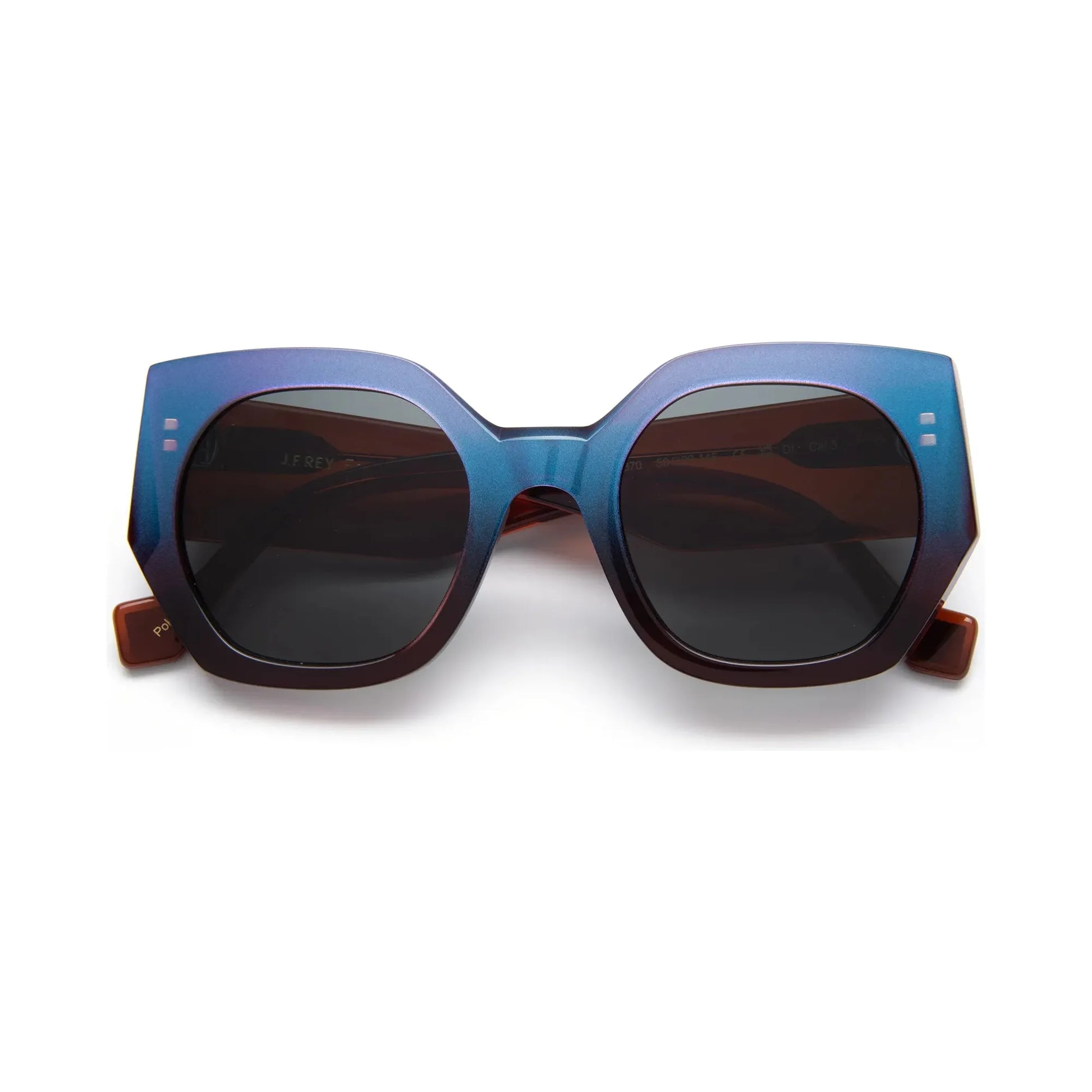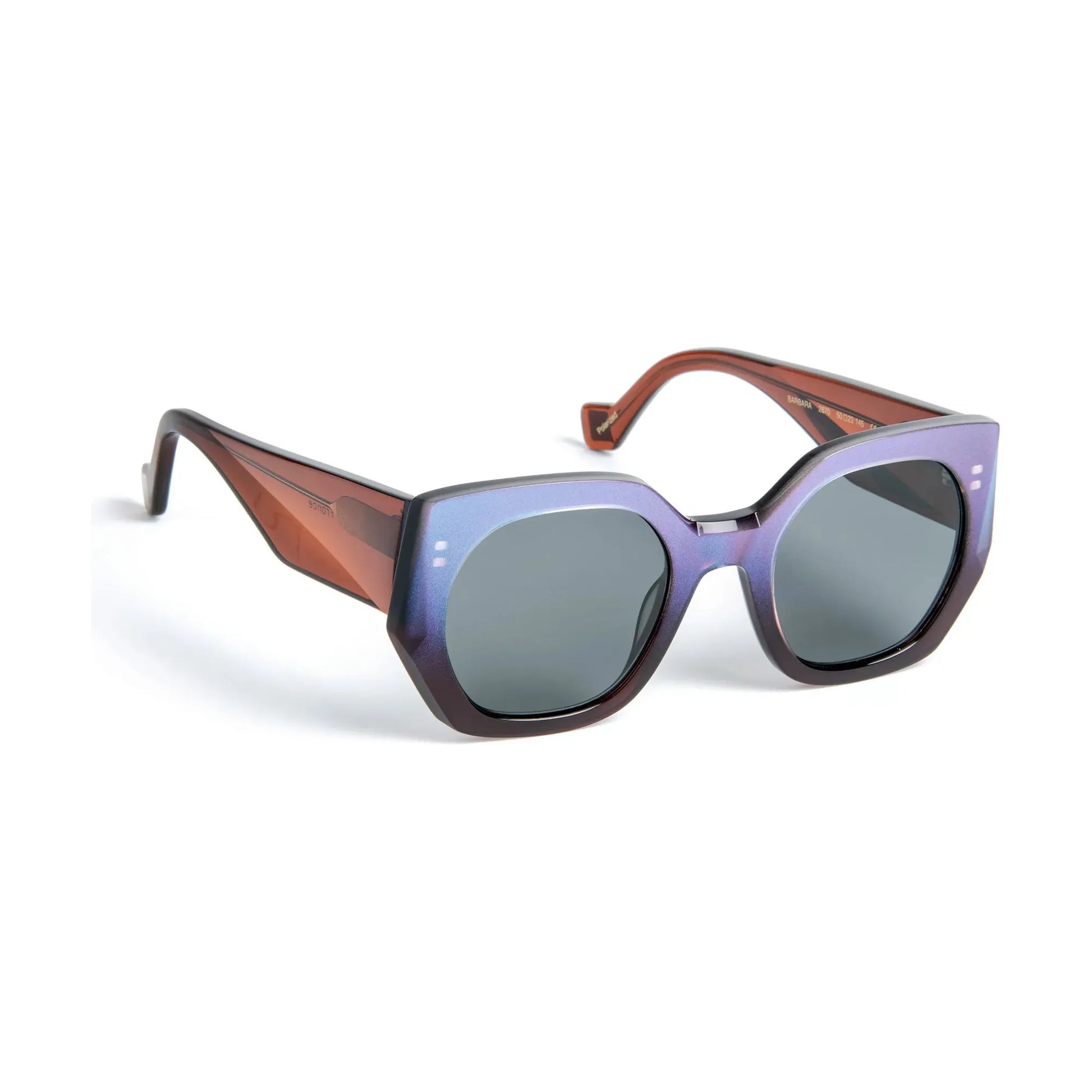 Sunglasses in acetate, with a refined design enhanced by an entirely hand-crafted faceted finish. Its wide, hollow-sculpted temples add subtle reflections and a touch of modernity. The style is distinguished by a palette of iridescent gradations, offering a play of light and changing shades that sparkle on the face of the frame.