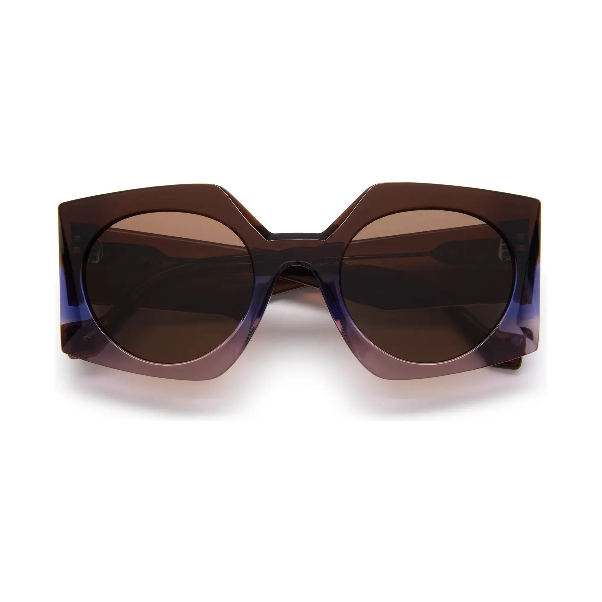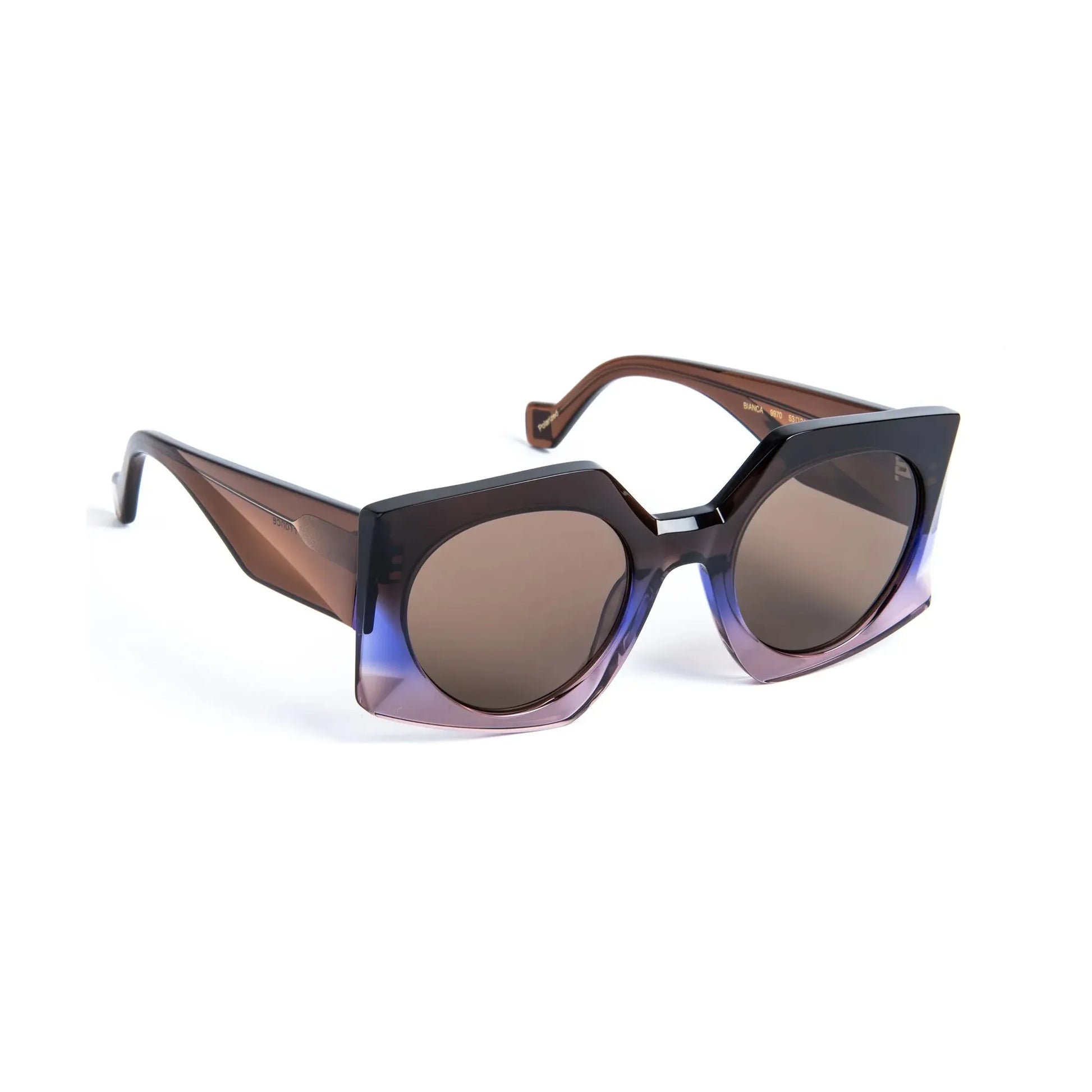 Sunglasses in acetate, with a refined design enhanced by an entirely hand-crafted faceted finish. Its wide, hollow-sculpted temples add subtle reflections and a touch of modernity. The style is distinguished by a palette of translucent gradient colors, offering a play of light and changing shades that sparkle on the face of the frame.