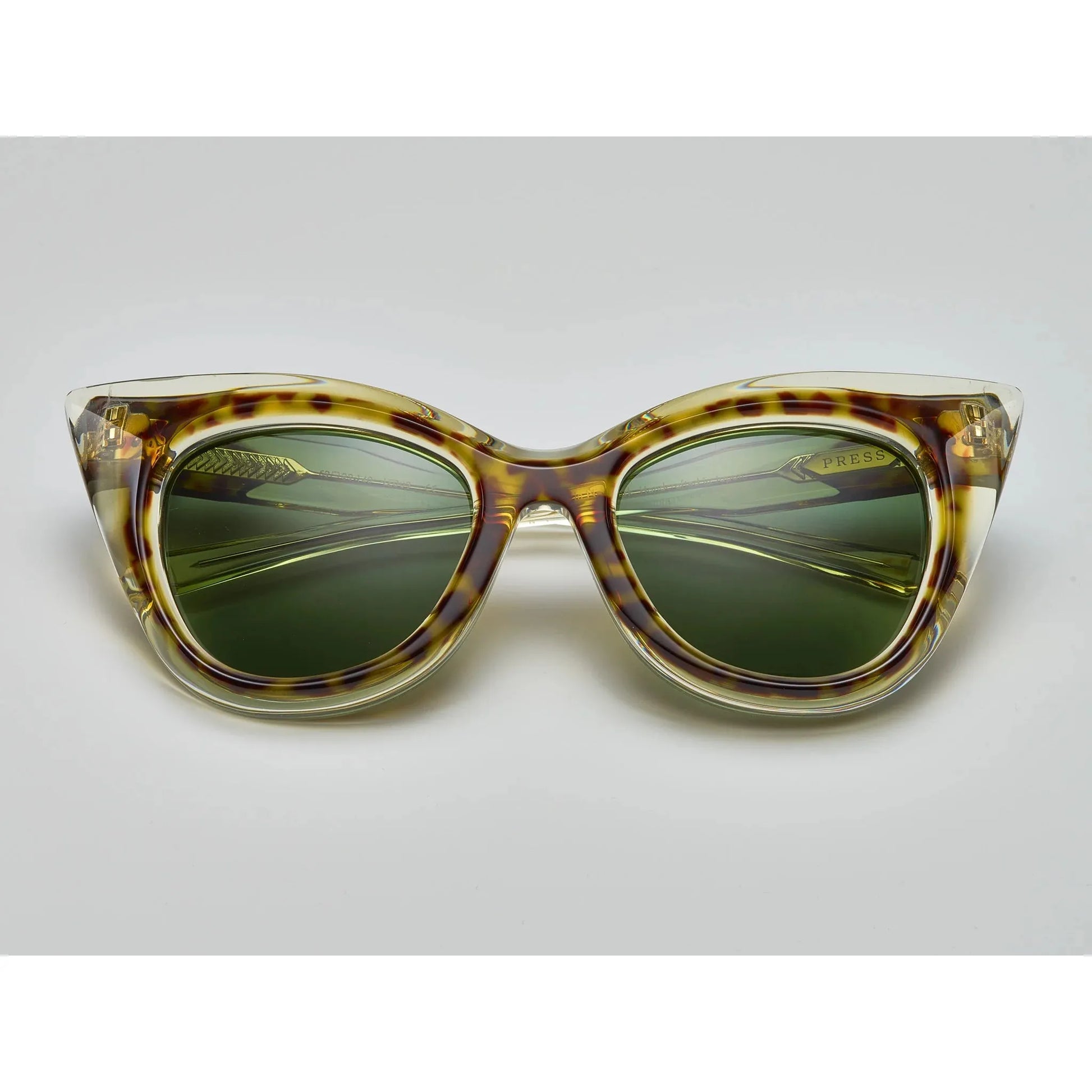 Angled and soft, bold and feminine, the inspirational traits we took from the artist. The sculptural form of faceting here shows off the depth of color and plays between the angular and soft lines of this cat eye. The frame brings the fire to every room she’s in, and each person who wears this style should feel that fire burn.